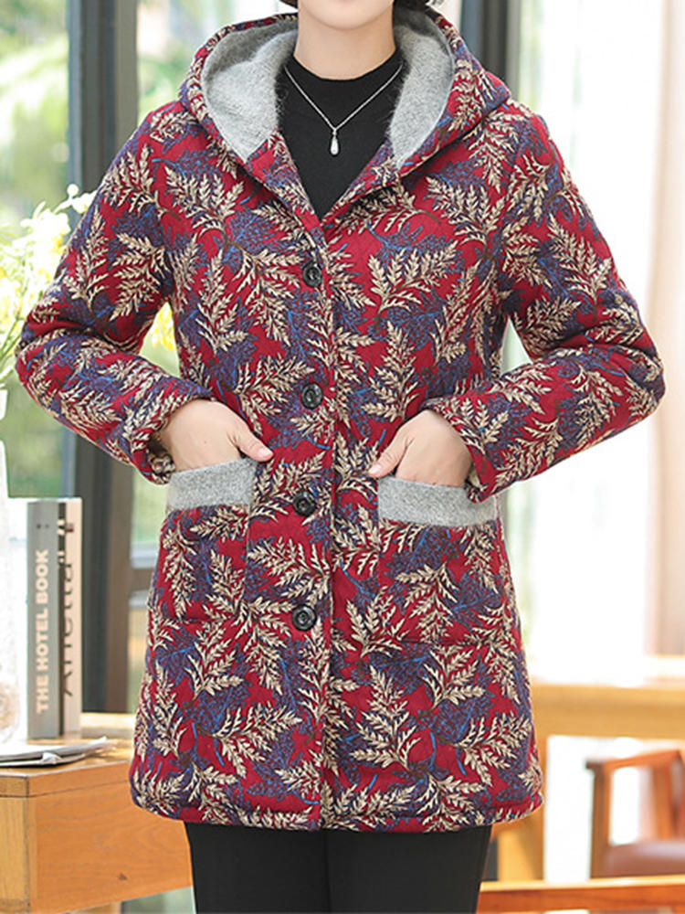vendimia Mujer Botón de patchwork con estampado floral Abrigos con capucha de manga larga COD