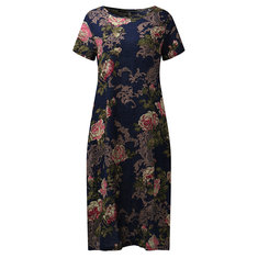 Folk Style Mujer Random Printed Midi Vestido con bolsillo