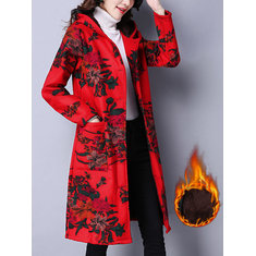 Folk Style Mujer Capucha de manga larga Floral Impreso terciopelo abrigo caliente